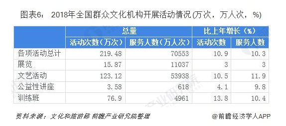 2018年全國群眾文化機構共組(zǔ)織開展(zhǎn)各類文化活動219.48萬場次,比上年增長10.9%;服務人次70553萬,比(bǐ)上年增長10.3%。