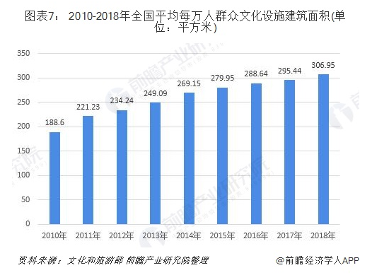 2018年末全國群眾文化機構實際使用房屋建築麵積4283.09萬平方(fāng)米,比上年末增長4.3%;業務(wù)用房麵積(jī)3146.17萬平方米,比上年(nián)末增長5.7%。年末全國平均每萬人群眾(zhòng)文化設施建(jiàn)築麵積306.95平方米,比上年末提高11.51平方米。